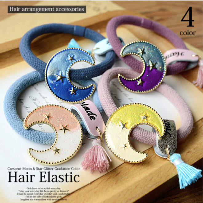 ハンドメイド風なヘアゴムです。タッセルと月のコンビネーションが可愛いです!